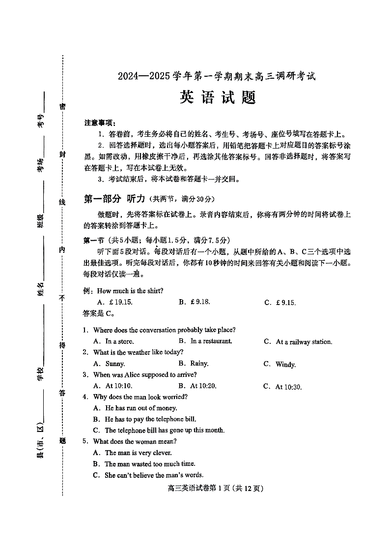 河北省保定市2025届第一学期1月期末高三调研考试英语+答案