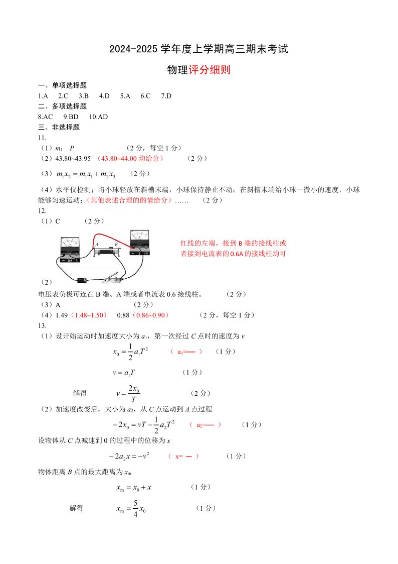 河北省保定市2025届第一学期1月期末高三调研考试物理答案