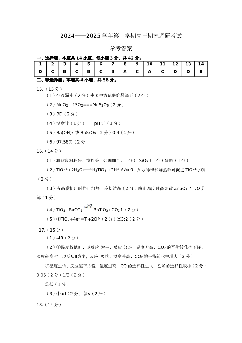 河北省保定市2025届第一学期1月期末高三调研考试化学答案