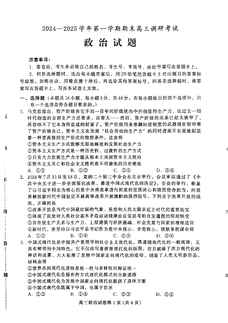 河北省保定市2025届第一学期1月期末高三调研考试政治
