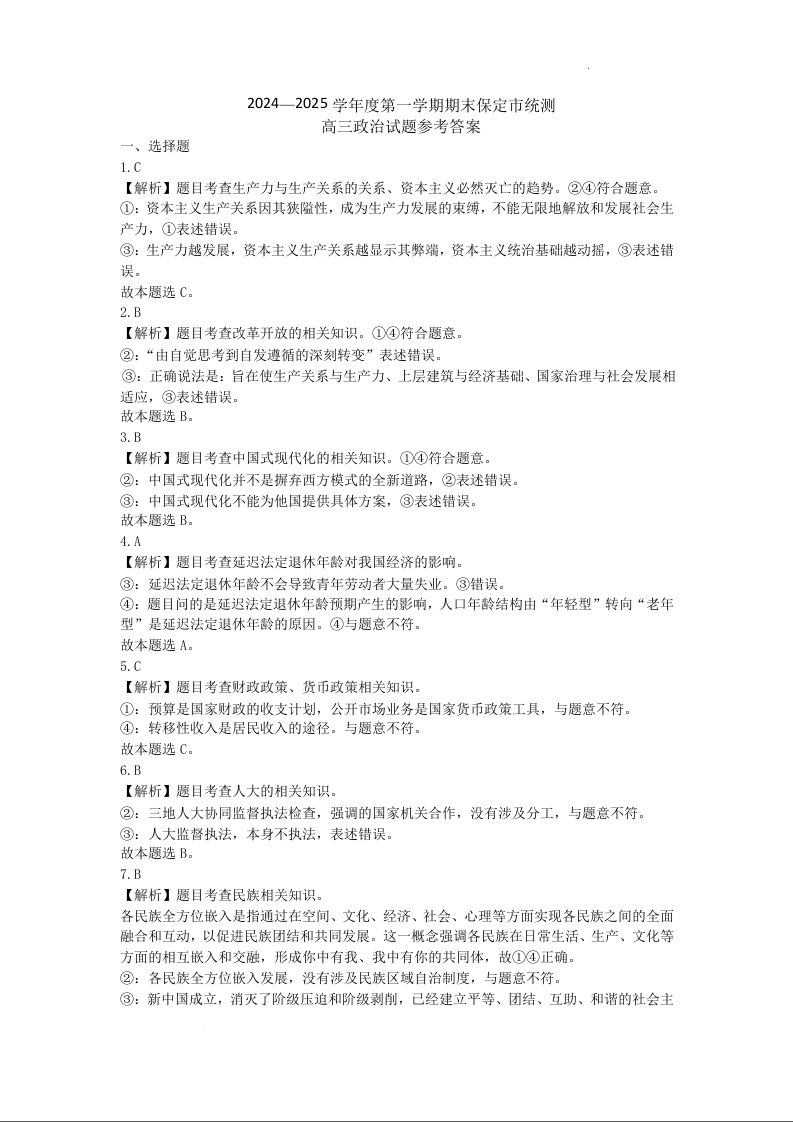 河北省保定市2025届第一学期1月期末高三调研考试政治答案