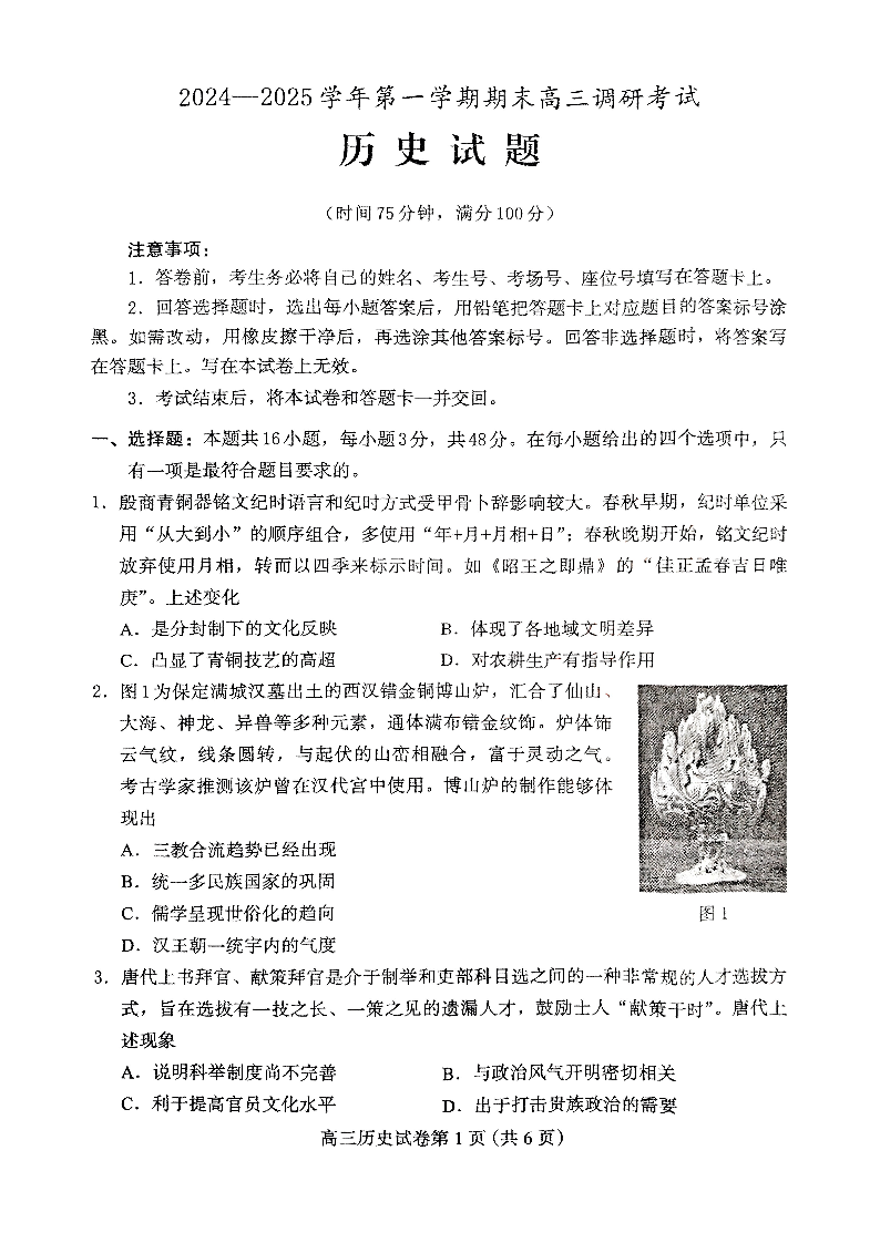 河北省保定市2025届第一学期1月期末高三调研考试历史+答案