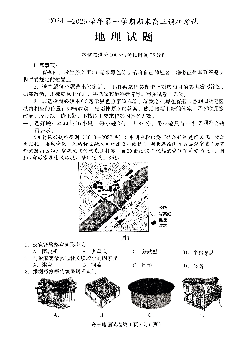 河北省保定市2025届第一学期1月期末高三调研考试地理