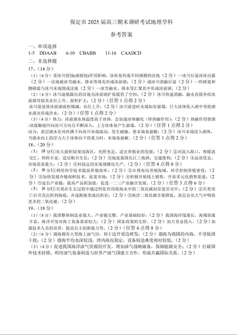 河北省保定市2025届第一学期1月期末高三调研考试地理答案