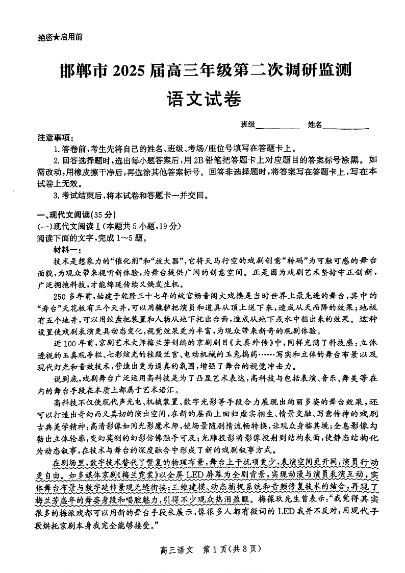 河北省邯郸市2025届高三年级第二次调研监测(邯郸二模)语文