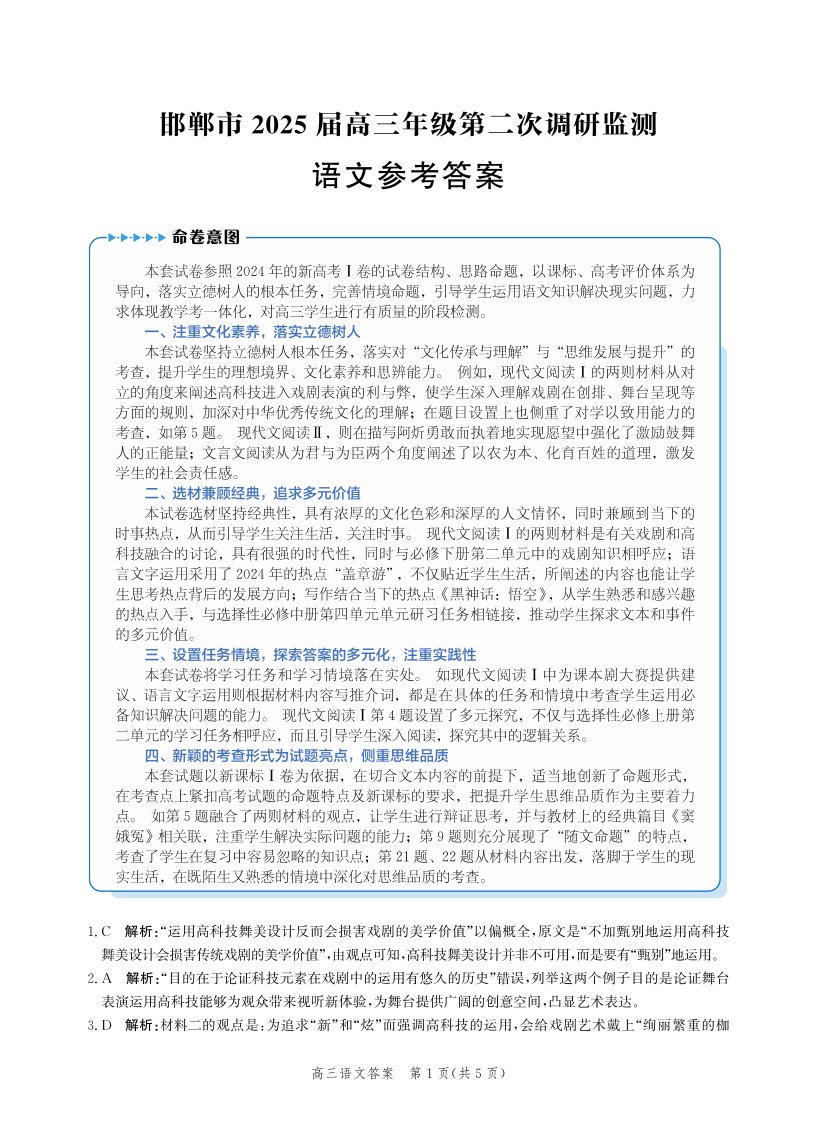 河北省邯郸市2025届高三年级第二次调研监测(邯郸二模)语文答案