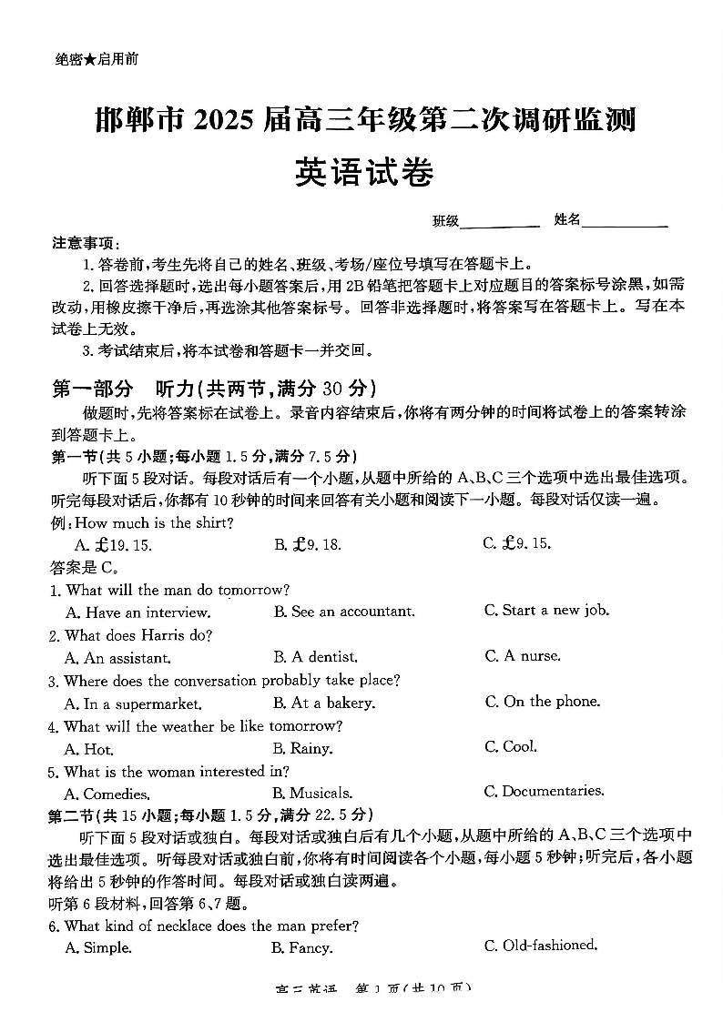 河北省邯郸市2025届高三年级第二次调研监测(邯郸二模)英语
