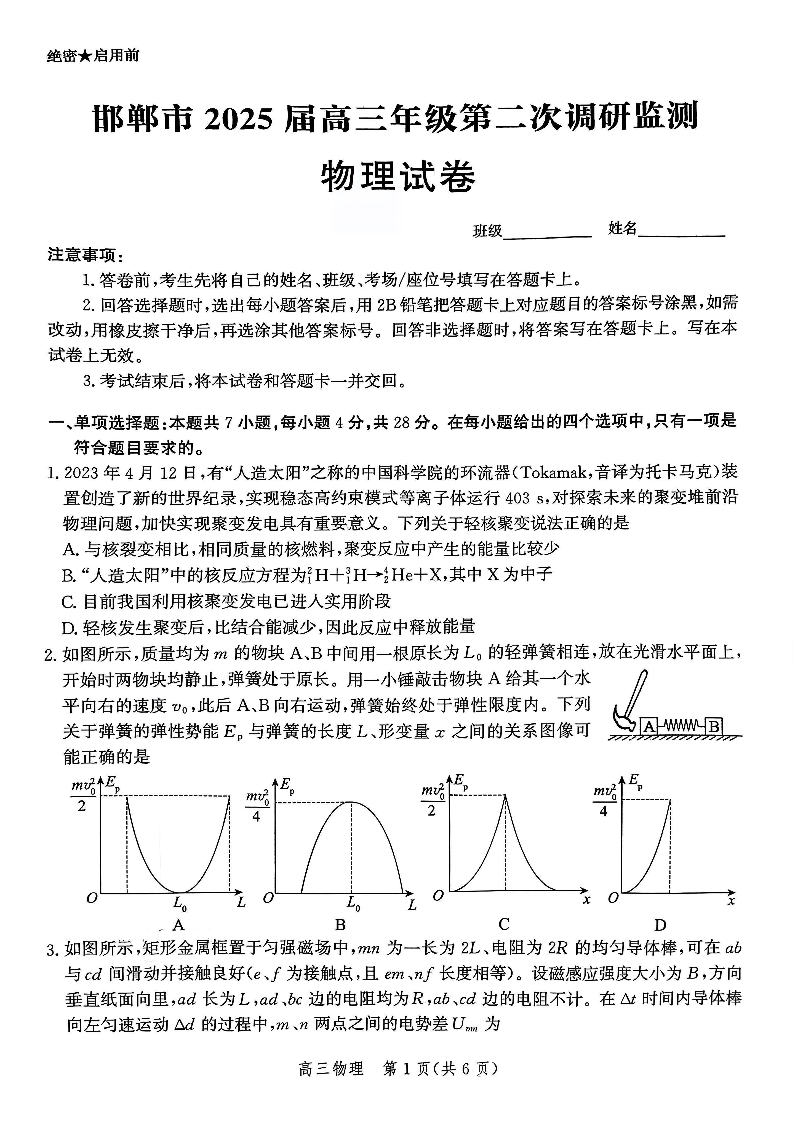 河北省邯郸市2025届高三年级第二次调研监测(邯郸二模)物理