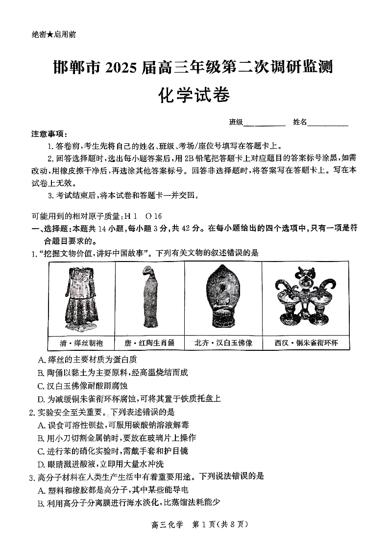 河北省邯郸市2025届高三年级第二次调研监测(邯郸二模)化学