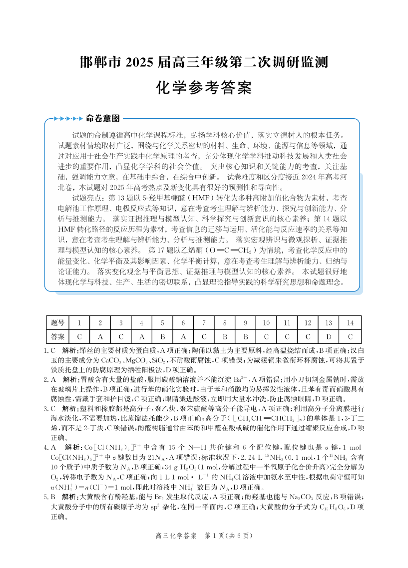 河北省邯郸市2025届高三年级第二次调研监测(邯郸二模)化学答案