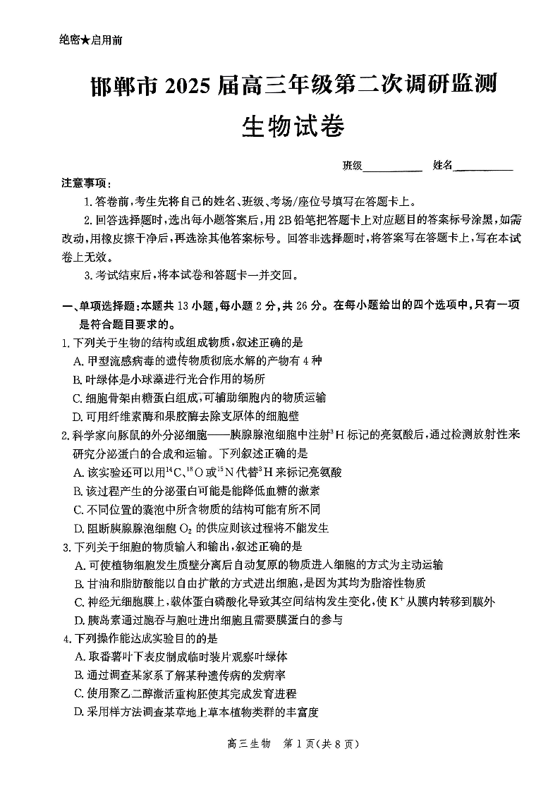 河北省邯郸市2025届高三年级第二次调研监测(邯郸二模)生物