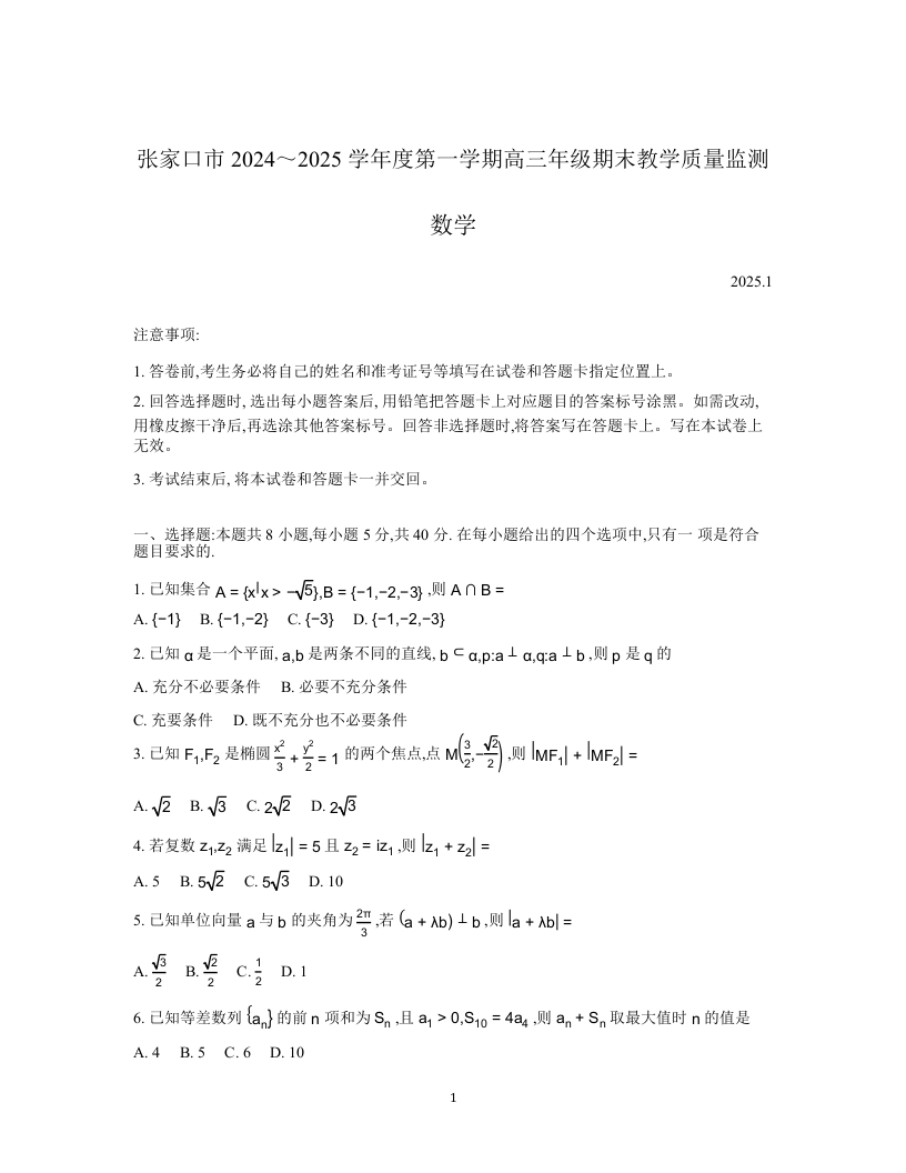 河北省张家口市 2025届高三年级第一学期1月期末教学质量监测数学