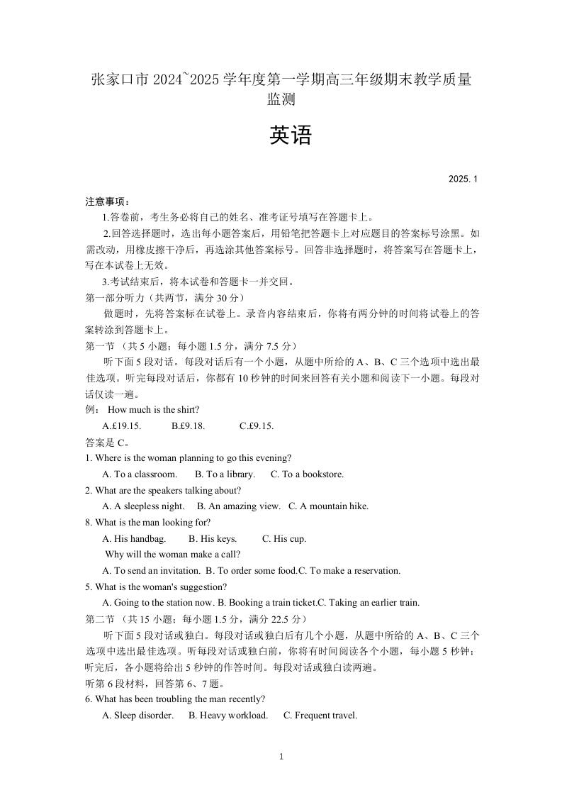 河北省张家口市 2025届高三年级第一学期1月期末教学质量监测英语