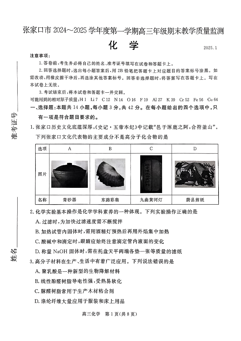 河北省张家口市 2025届高三年级第一学期1月期末教学质量监测化学