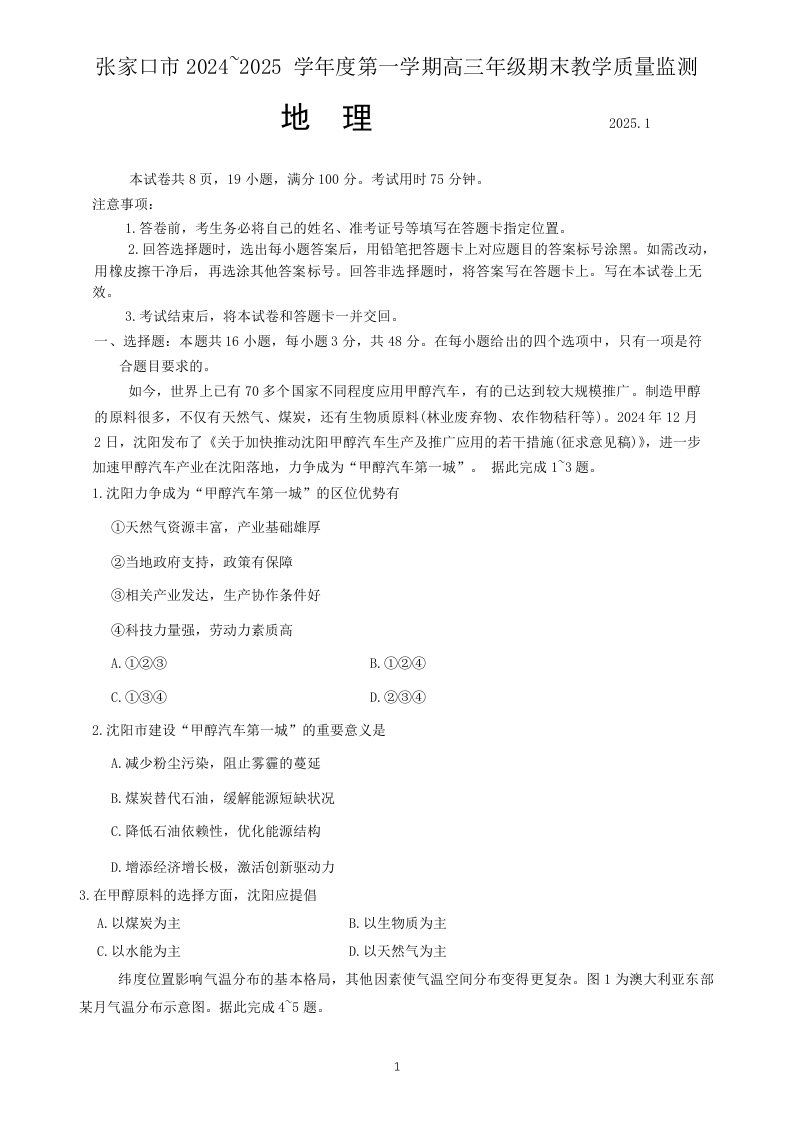 河北省张家口市 2025届高三年级第一学期1月期末教学质量监测地理