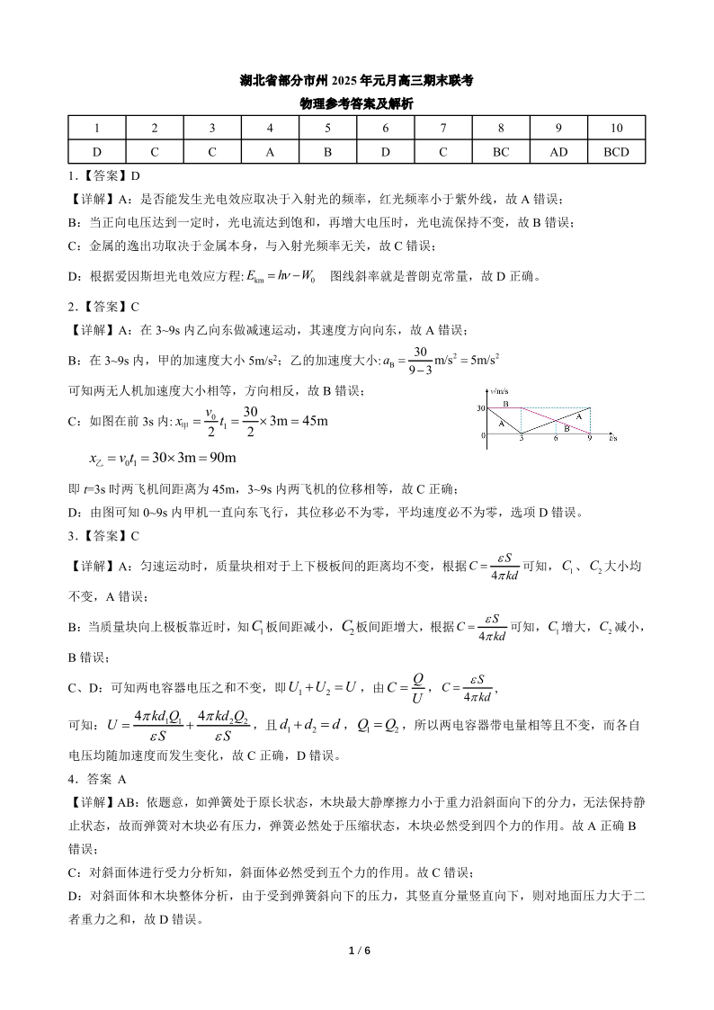 湖北省部分市州元月2025届高三期末联考物理答案