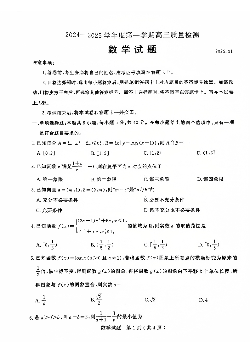 山东省济宁市2025届高三第一学期1月期末质量检测数学