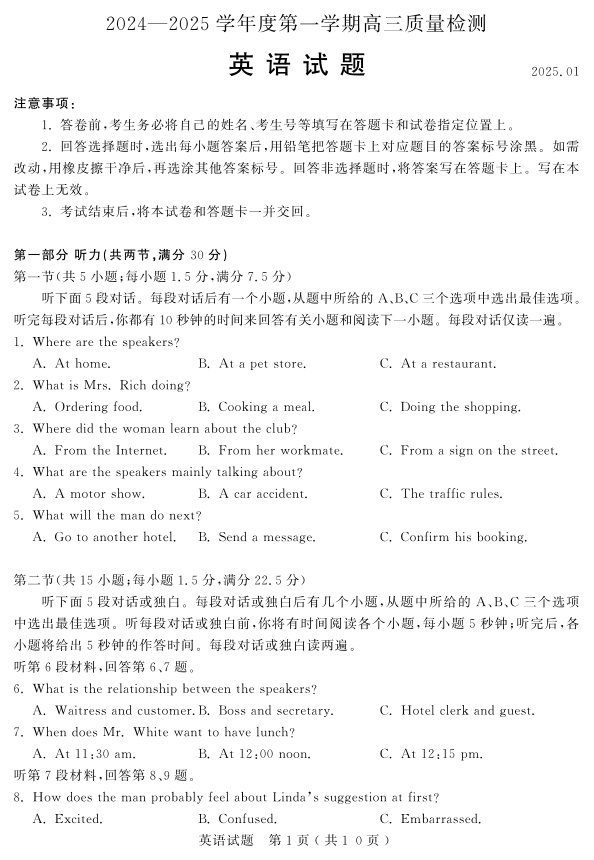 山东省济宁市2025届高三第一学期1月期末质量检测英语