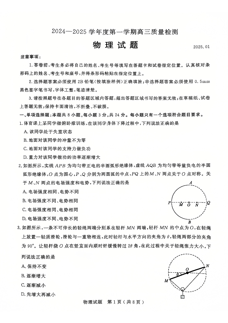 山东省济宁市2025届高三第一学期1月期末质量检测物理