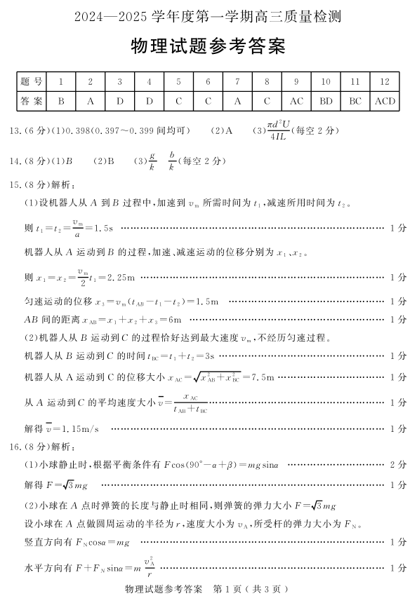 山东省济宁市2025届高三第一学期1月期末质量检测物理答案