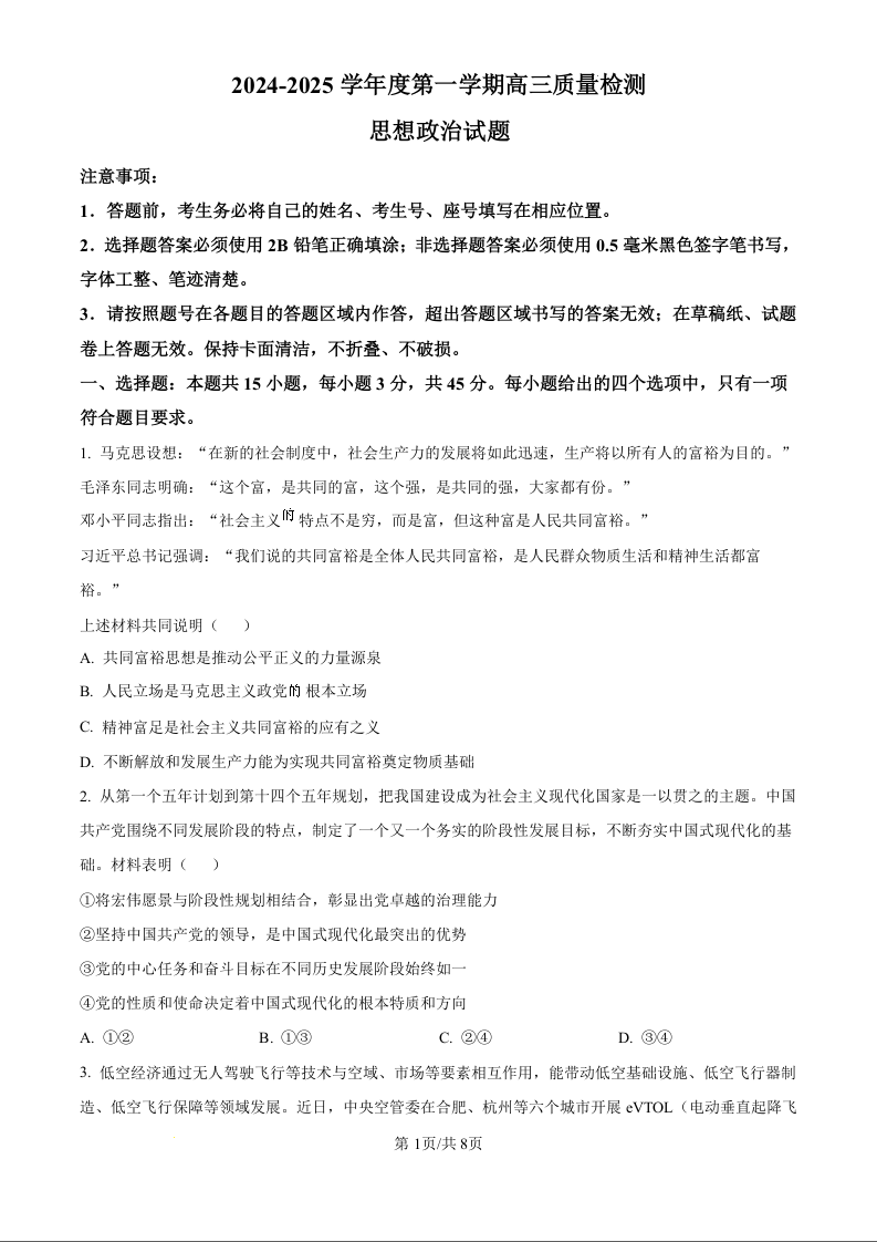 山东省济宁市2025届高三第一学期1月期末质量检测政治(原卷版)