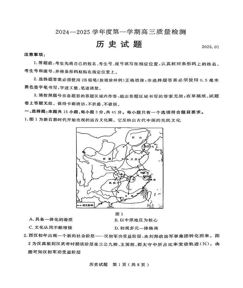 山东省济宁市2025届高三第一学期1月期末质量检测历史+答案