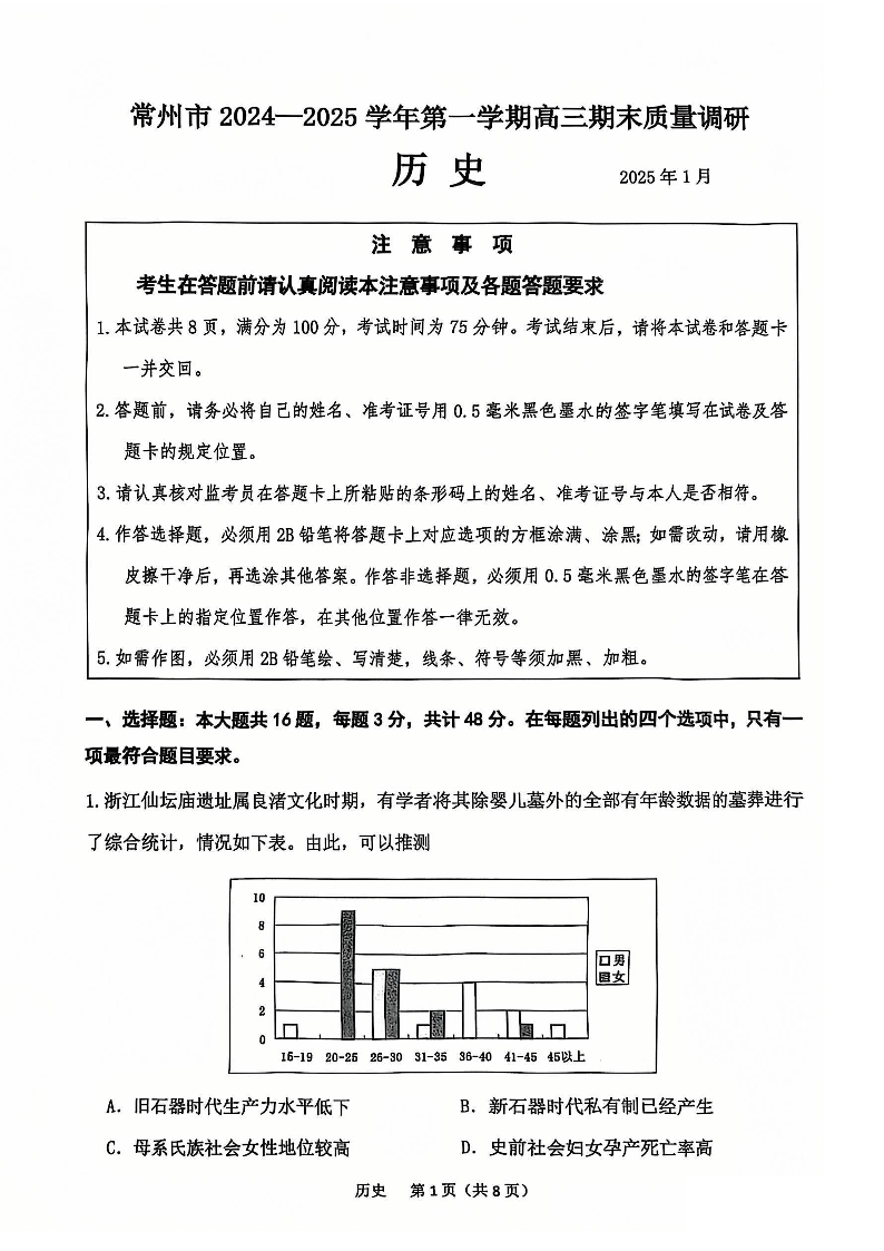 江苏省常州市 2025届高三第一学期1月期末质量调研历史