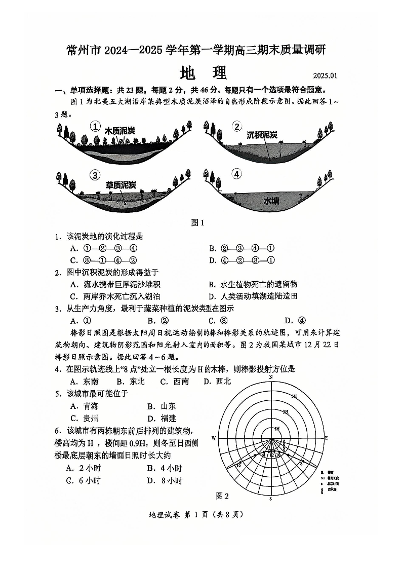 江苏省常州市 2025届高三第一学期1月期末质量调研地理+答案