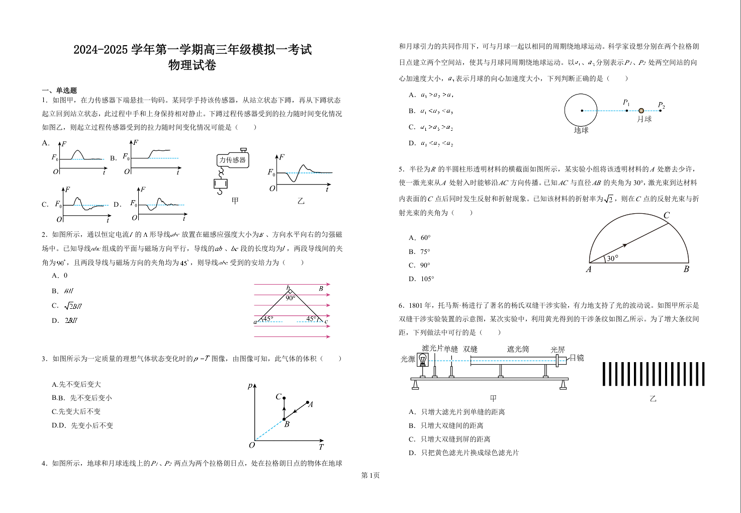 江苏省泰州中学2025届高三上学期一模考试物理+答案