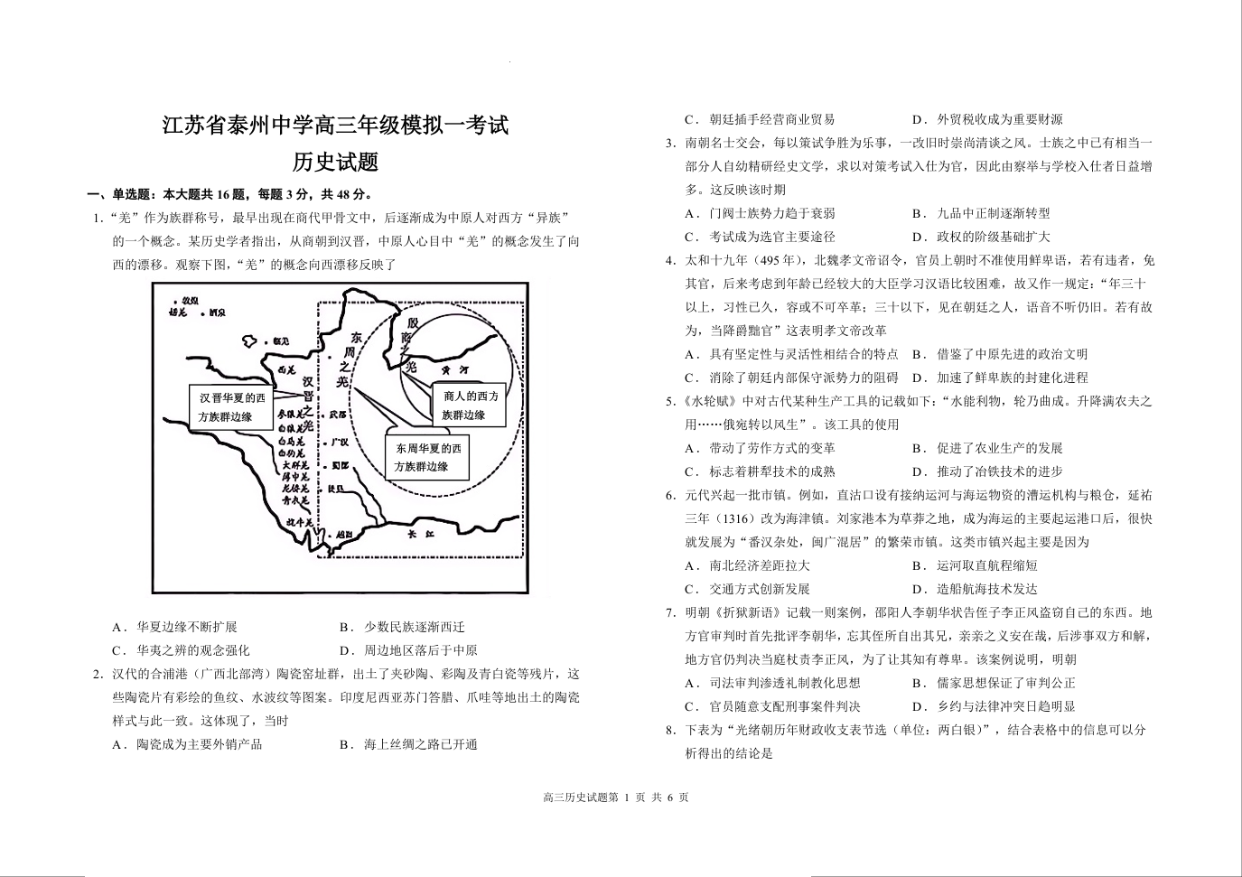 江苏省泰州中学2025届高三上学期一模考试历史+答案