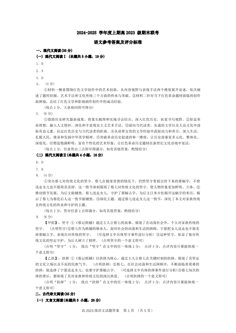 四川省名校联盟2024-2025学年高二上学期期末联考语文答案