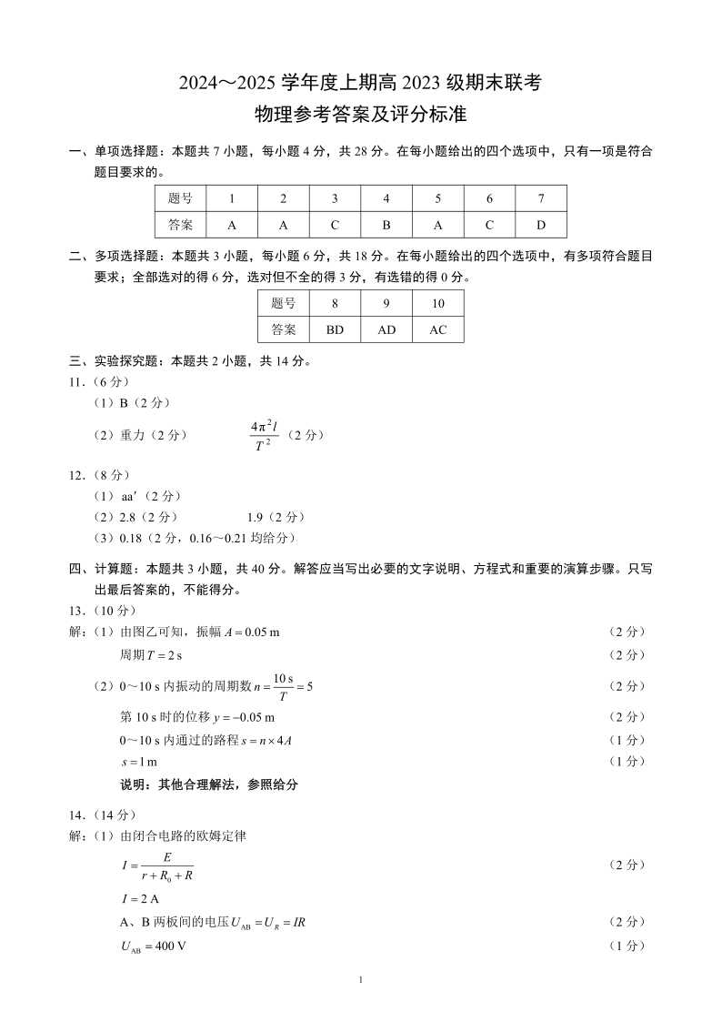四川省名校联盟2024-2025学年高二上学期期末联考物理答案