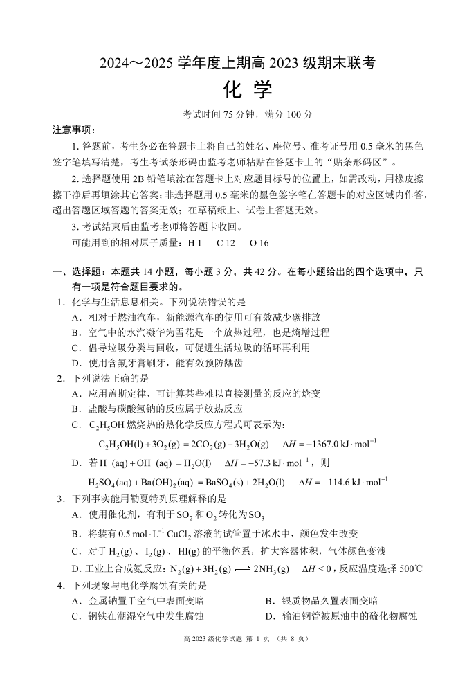 四川省名校联盟2024-2025学年高二上学期期末联考化学