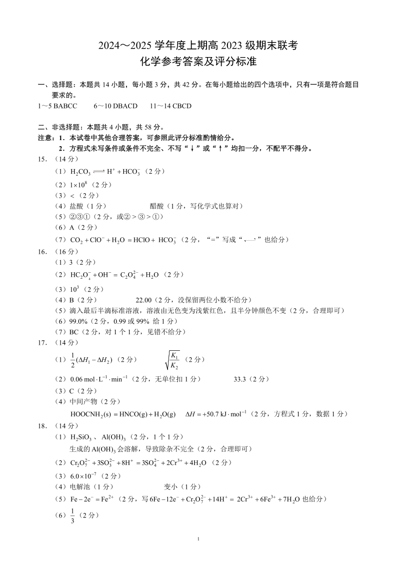 四川省名校联盟2024-2025学年高二上学期期末联考化学答案
