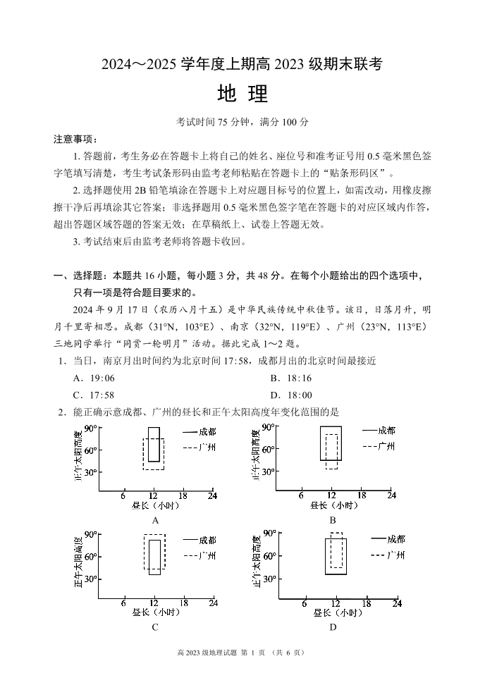 四川省名校联盟2024-2025学年高二上学期期末联考地理