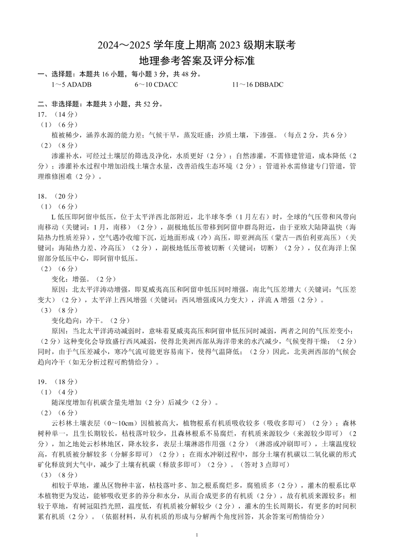 四川省名校联盟2024-2025学年高二上学期期末联考地理答案