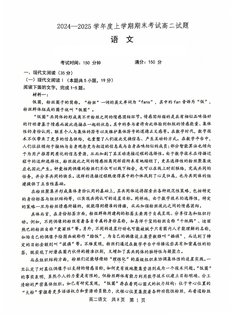辽宁省辽南协作体2024-2025学年高二上学期期末考试语文