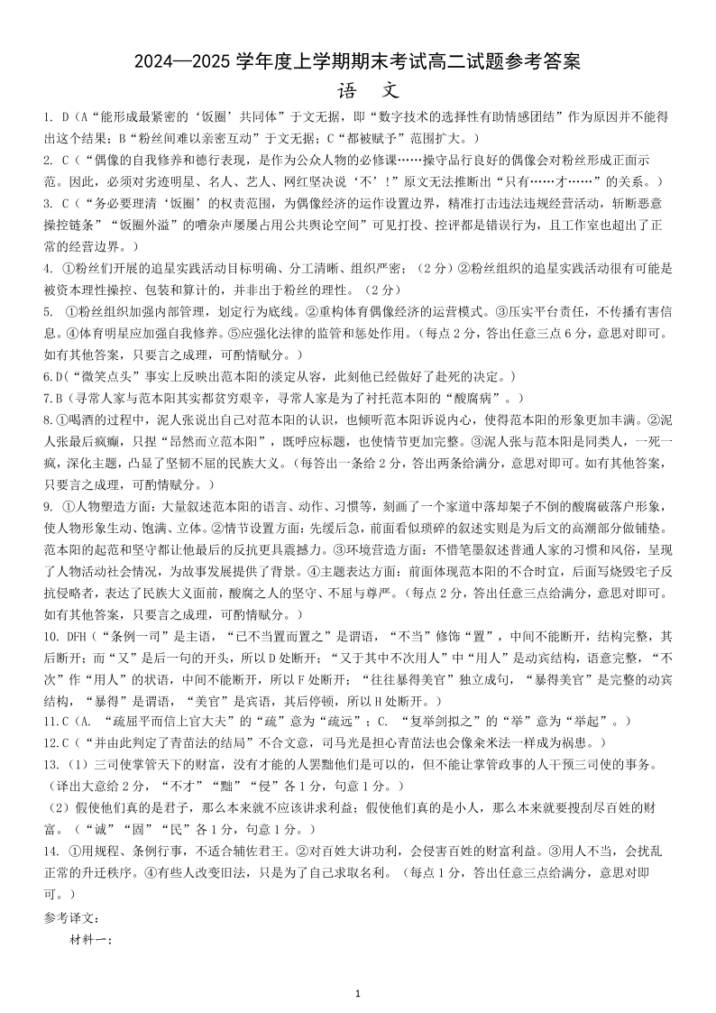 辽宁省辽南协作体2024-2025学年高二上学期期末考试语文答案