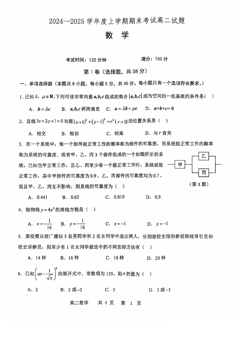 辽宁省辽南协作体2024-2025学年高二上学期期末考试数学