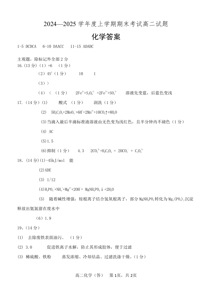 辽宁省辽南协作体2024-2025学年高二上学期期末考试化学答案