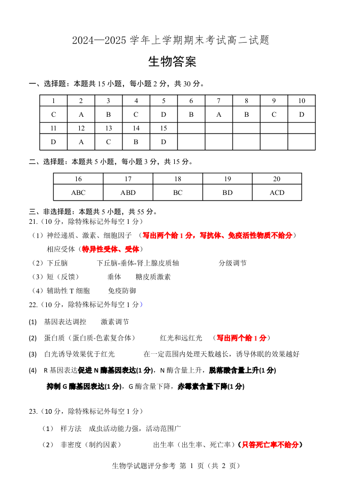 辽宁省辽南协作体2024-2025学年高二上学期期末考试生物答案