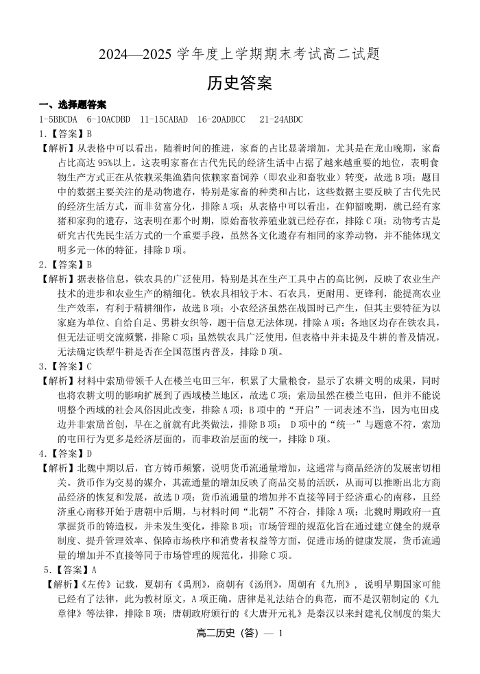 辽宁省辽南协作体2024-2025学年高二上学期期末考试历史答案