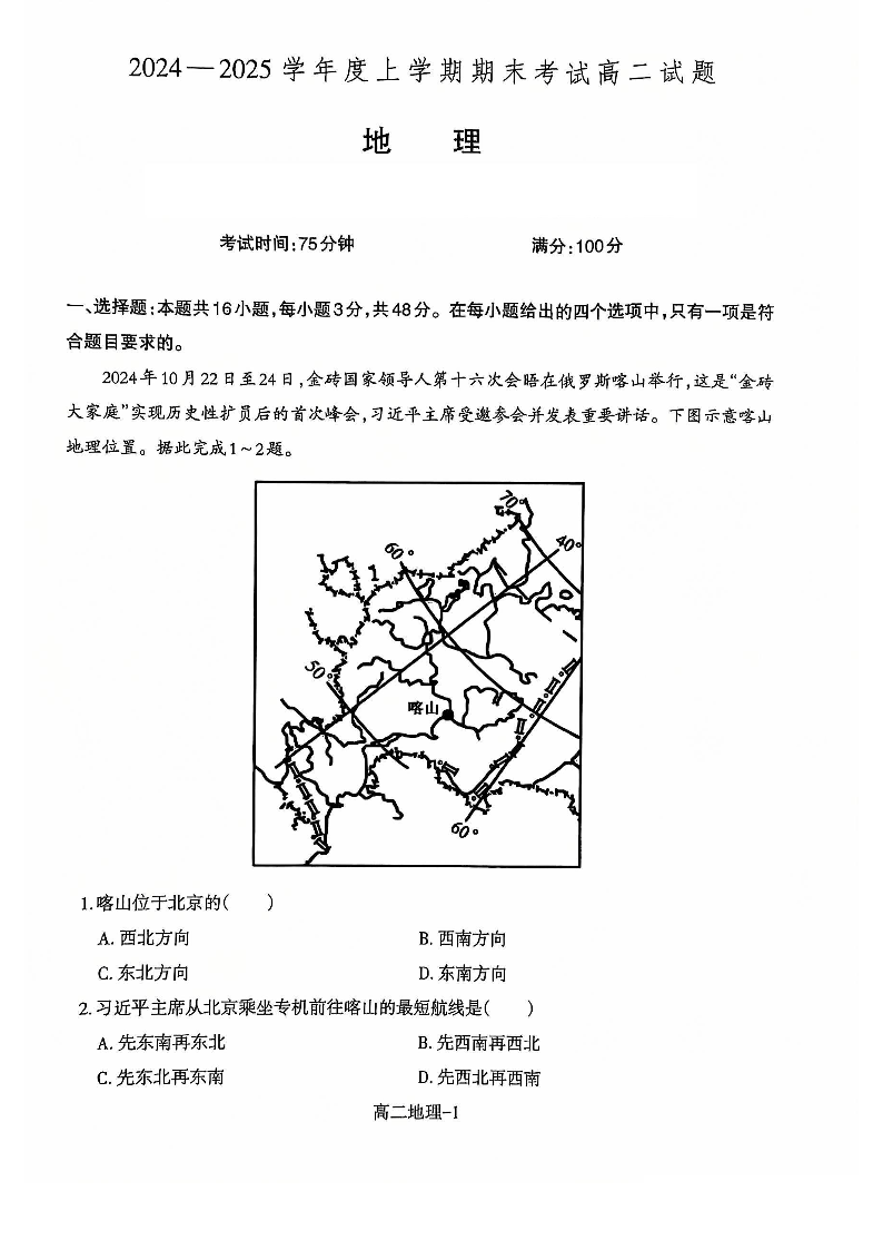 辽宁省辽南协作体2024-2025学年高二上学期期末考试地理