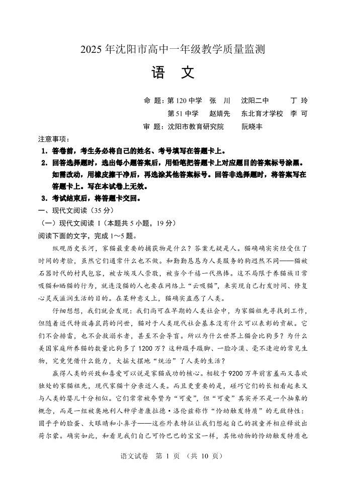 辽宁省沈阳市2024—2025学年高一上学期期末考试语文
