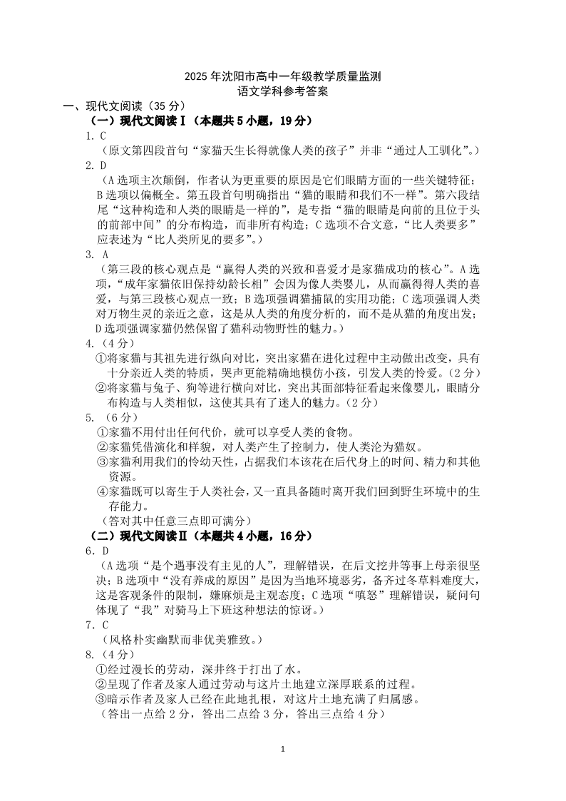 辽宁省沈阳市2024—2025学年高一上学期期末考试语文答案