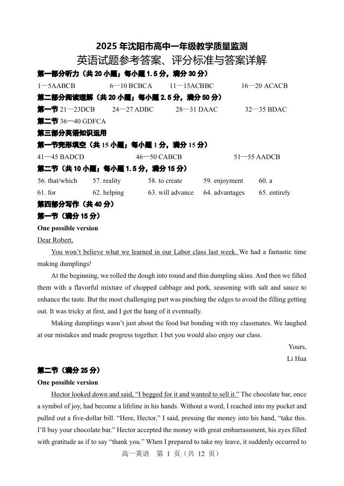 辽宁省沈阳市2024—2025学年高一上学期期末考试英语答案