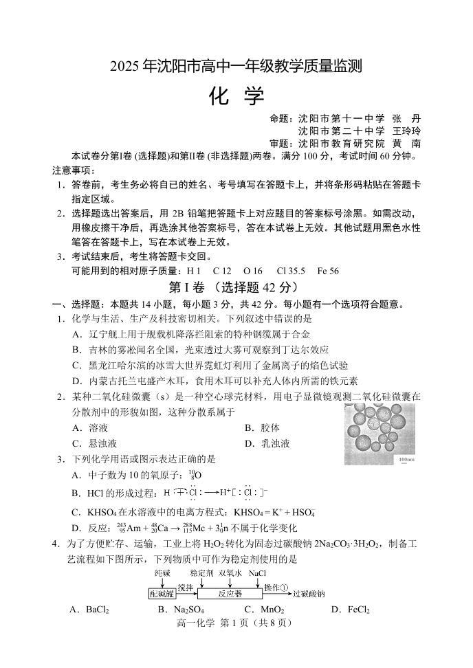 辽宁省沈阳市2024—2025学年高一上学期期末考试化学