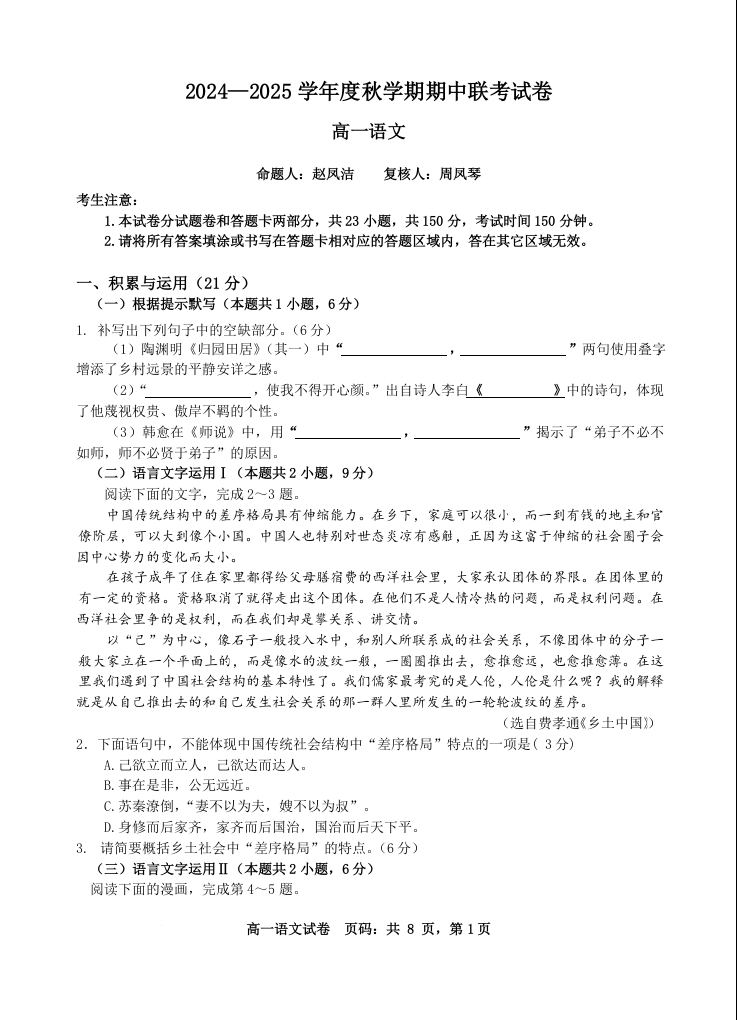 江苏省无锡市江阴市六校2024-2025学年高一上学期11月期中联考语文