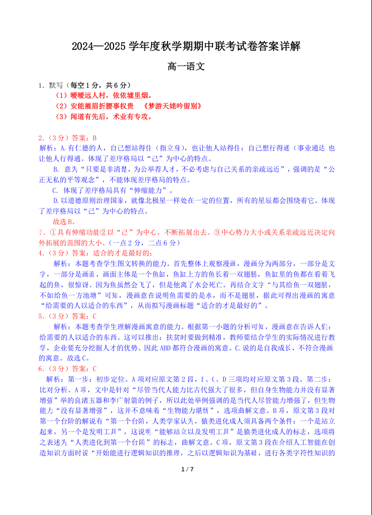 江苏省无锡市江阴市六校2024-2025学年高一上学期11月期中联考语文答案