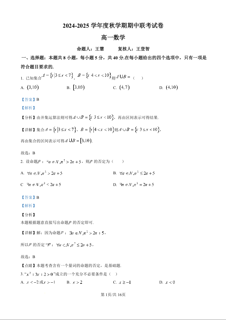 江苏省无锡市江阴市六校2024-2025学年高一上学期11月期中联考数学(精品解析版)